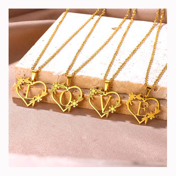 Hot Selling 18k Gold Stainless Steel 26 English Letter Heart Pendant Necklace Women Fashion Flower Necklace Jewelry for Gift